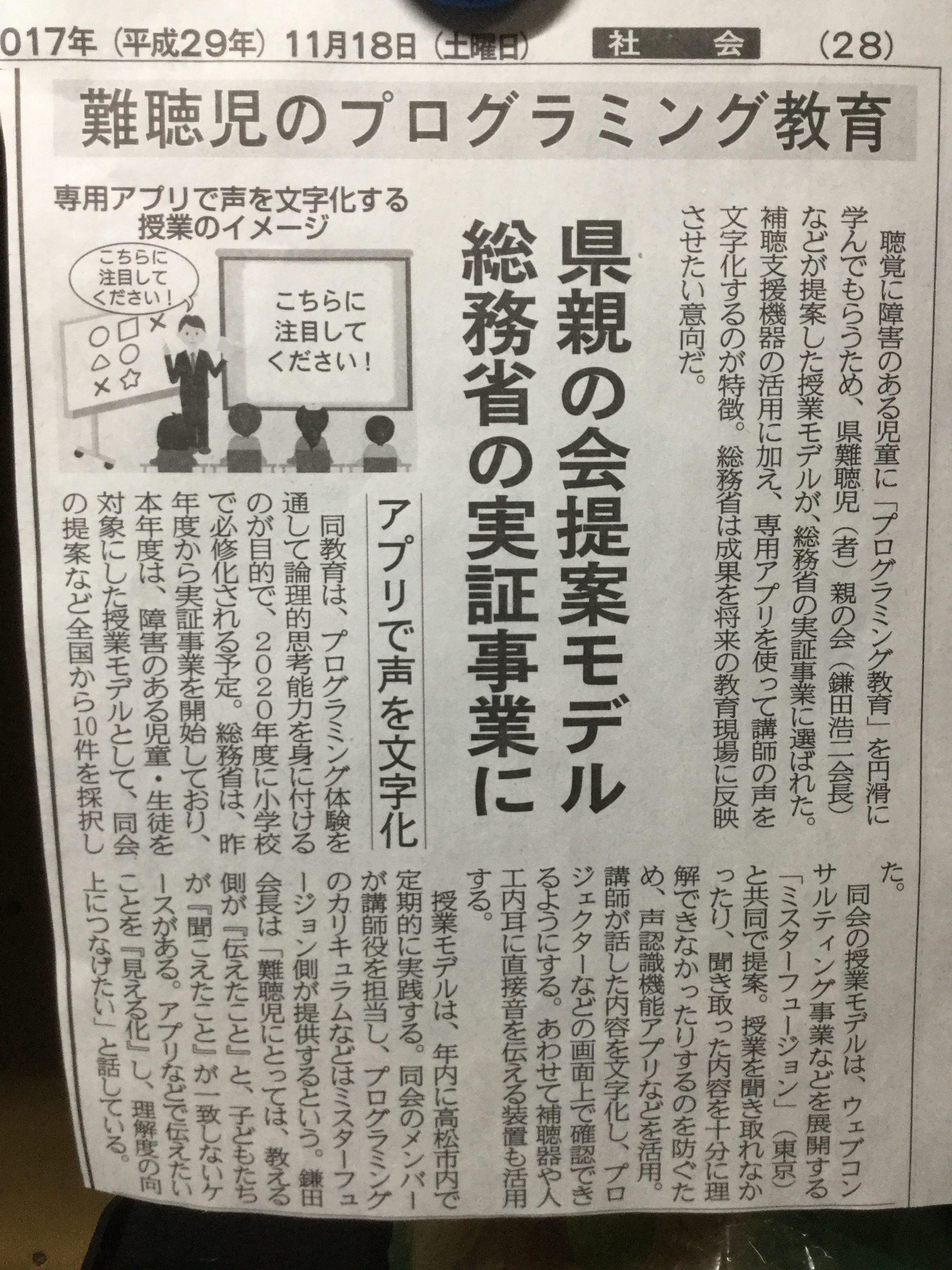 投稿日: 2017年11月20日 投稿者: nancho37この度総務省事業が四国新聞に掲載されました。 今年度親の会で取り組んでいます「障害を持つ児童生徒を対象としたプログラミング教育実施モデル実証事業」が11月18日付け四国新聞に掲載されました! 新聞記事はこちら FacebooktwitterHatenaPocket